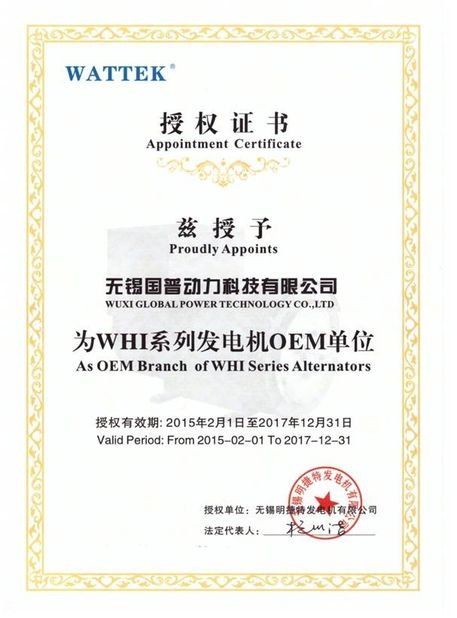 Standard:Appointment Certificate Issue Date:2015-02-01 Expiry Date:2017-12-31 Scope/Range:WHI Series Alternators  |