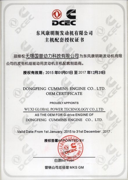 Standard:OEM Certificate Issue Date:2015-01-01 Expiry Date:2017-12-31 Scope/Range:Dongfeng Cummins Engine Issued By:Dongfeng Cummins Company  |